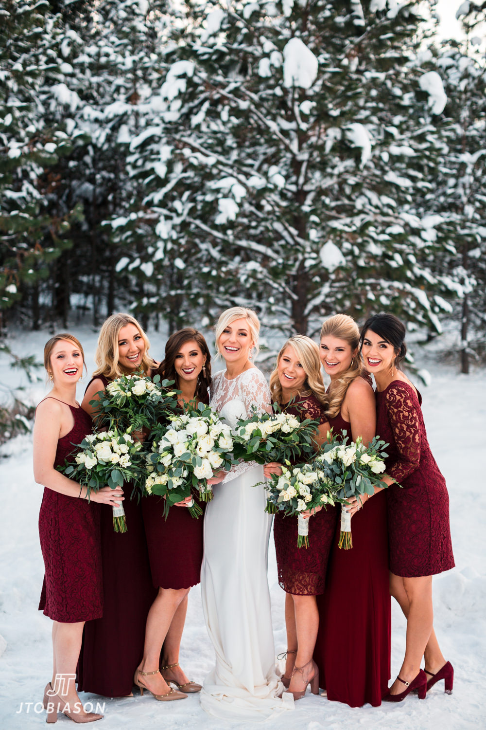 Can we just pause and talk about how beautiful wedding dresses are in the snow. As a native Seattleite, snow is still such a novelty, but I am just beside myself with this opportunity to make photos (and amazed with the fact Natalie could withstand the freezing temperatures with a smile)! I also absolutely loved the way that the maroon bridesmaid dresses popped off the snow.
